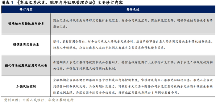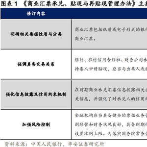 商业汇票的管理最早可追溯至1997年,中国人民银行发布《商业汇票承兑、贴现与再贴现管理暂行办法》,规范商业汇票相关业务操作,时至今日,《暂行办法》中的部分要求不再适用于当前的经济环境,因而中国人民银行、银保监会联合对《暂行办法》进行修订后形成了《商业汇票承兑、贴现与再贴现管理办法》。具体而言,根据央行发布会答记者问的内容,《办法》主要就明确相关票据性质与分类,强调真实交易关系,强化信息披露及信用约束机制,以及加强风险控制四个方面展开修订。