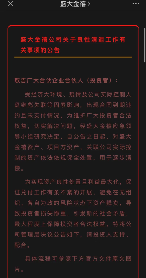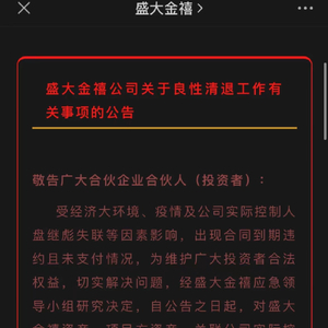 11月19日凌晨,盛大金禧在其微信公众号发布《盛大金禧公司关于良性清退工作有关事项的公告》,许多投资者表示,看到公告后随即到盛大金禧讨要投资本金,但都空手而归。