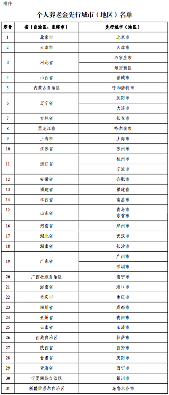 据披露,个人养老金先行试点城市(地区)共有36个,当中既有北上广深等一线城市,也有成都、长沙、苏州等新一线城市。具体而言,它们分别是: