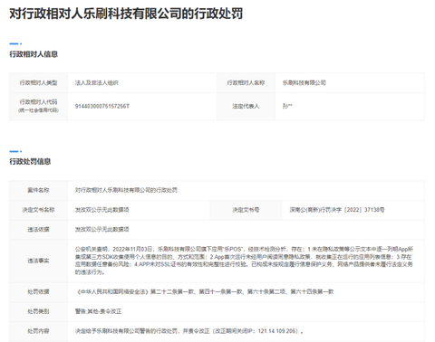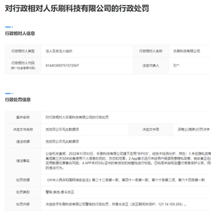 去年5月,中国人民银行南宁中心支行作出的行政处罚信息公示表显示,乐刷广西分公司又因未按规定开展客户身份识别;未准确标识并完整发送交易信息;特约商户收单银行结算账户管理不到位;为不满足条件的特约商户提供T+0资金结算服务等四项违法行为,被罚款80.1万元。此外,时任乐刷广西分公司的副总经理因未按规定开展客户身份识别,被罚款3.8万元。