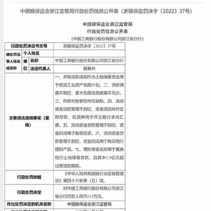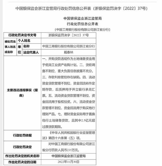 12月7日消息,中国银保监会浙江监管局行政处罚信息公开表显示,中国工商银行股份有限公司浙江省分行因存在并购贷款违规作为土地储备资金用于低效工业资产收购计划等七项违法违规行为,被罚款235万元。