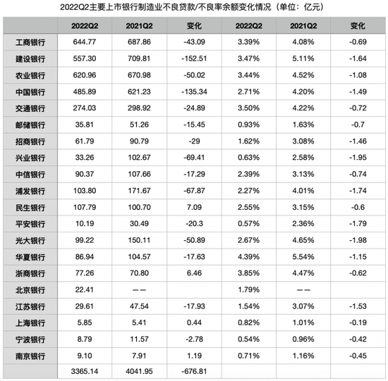 对比来看,占据不良贷款大头的制造业不良贷款余额,截至2022年6月末,20家银行余额为3365.14亿元,同比减少超过650亿元。
