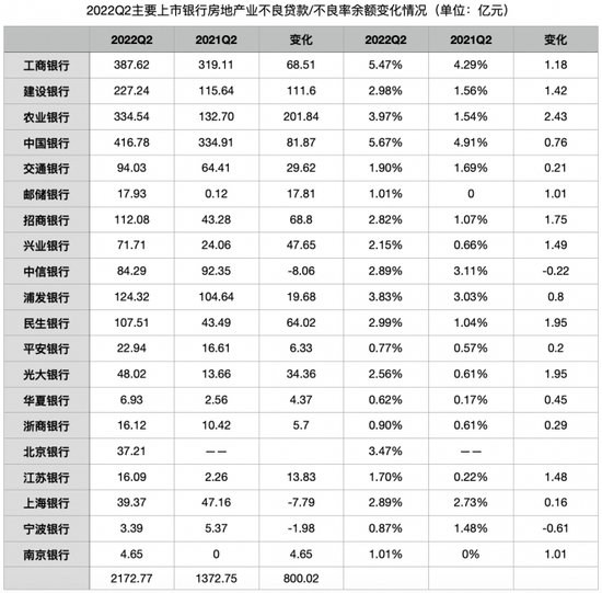 从变化看,仅有3家银行的房地产不良贷款余额有所下降,其余银行均增加,其中农业银行、建设银行增加超过100亿元,前者超过200亿元;仅2家银行的房地产不良率下降,其余银行均增加,增幅超过1个百分点的有10家。