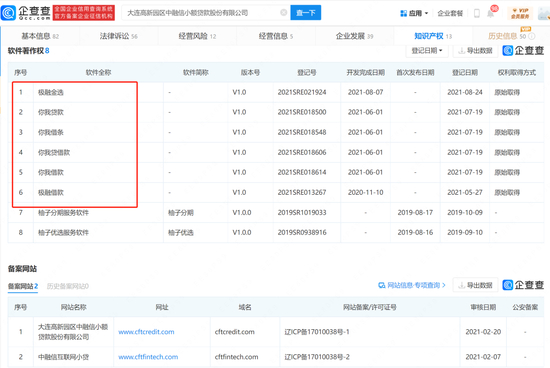 进一步看,企查查信息显示,大连中融信小贷旗下有8个软件著作权,除了柚子分期和柚子优选,还包括嘉银金科旗下的6款APP,开发时间集中在2021年中。2021年2月20日,大连中融信小贷还完成了网站备案,打开后也显示为极融借款。也就是说,嘉银金科与该小贷公司的挂靠关系已经持续了近两年时间。