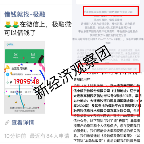 相关隐私政策显示,极融为大连高新园区中融信小额贷款股份有限公司(以下简称“大连中融信小贷”)及其委托的极融平台实际运营方极融云科信息技术有限公司(以下简称“极融云”)及其关联公司。