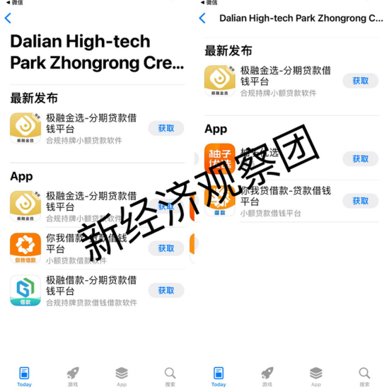 不仅如此。新经济观察团在苹果应用商店发现,大连中融信小贷还是极融金选、你我借款、极融借款、你我贷借款、柚子优选五个金融贷款APP的开发者。从名称上看,前四个均为嘉银金科旗下。
