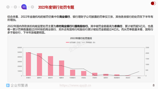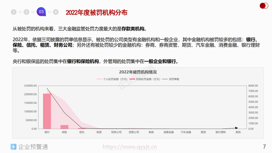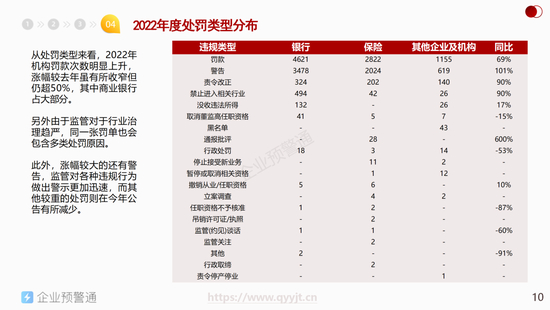 从处罚类型来看,2022年机构罚款次数明显上升,涨幅较去年虽有所收窄但仍超50%,其中商业银行占大部分。