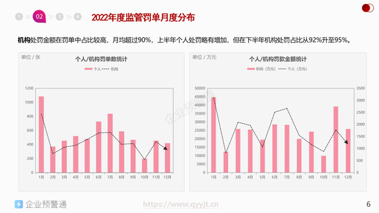 其中机构处罚金额30.6亿元,占比94%;个人处罚金额2.1亿元,占比6%。环比年中三司处罚,个人罚款占比略有下降。机构处罚金额在罚单中占比较高,月均超过90%,上半年个人处罚略有增加,但在下半年机构处罚占比从92%升至95%。