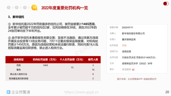 新华信托是2022年罚款最多的信托公司,被罚金额累计1465万元,全年累计被罚超千万的信托仅2家,位列总榜排在38名,其在2022年的24张罚单均在下半年开出。由于新华信托未事前报告关联交易;发放不当激励;通过关联方违规开展实业投资等13项业务问题,7月11日重庆银保监局披露,对机构处罚累计1450万元,原因为违规经营和未依法履行职责,同时问责16人包括取消董监高任职资格,禁止进入相关行业。