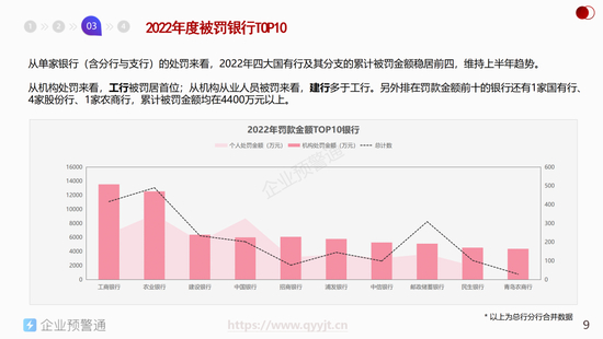 从单家银行(含分行与支行)的处罚来看,2022年四大国有行及其分支的累计被罚金额稳居前四,维持上半年趋势。从机构处罚来看,工行被罚居首位;从机构从业人员被罚来看,建行多于工行。另外排在罚款金额前十的银行还有1家国有行、4家股份行、1家农商行,累计被罚金额均在4400万元以上。