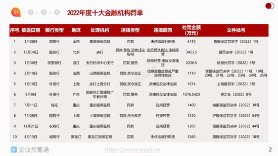 浙江网商银行是2022年罚款最多的民营银行,且单张罚单被处罚2236.5万元,为今年前10大罚单之一。网商银行在2022年共被处罚2次,均在上半年。由于违反金融统计管理、违反征信管理等4大相关规定,1月30日央行杭州中心支行披露,对机构和个人共计处罚2285.5万元,原因主要为违规经营和违反反洗钱法,同时问责9名从业人员。