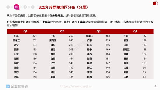 从罚单数量地区分布来看,黑龙江省罚单有1040张,跃至第一,广东和山东均超800张,相较今年上半年有所变化。其中,广东省和黑龙江省的罚单数在上半年较为突出,黑龙江省在下半年仍呈大幅增加趋势,浙江省与山东省在年末被处罚的次数有所增加。