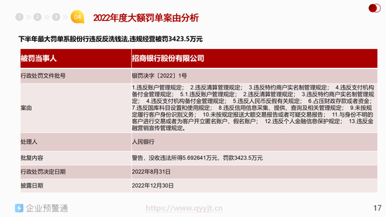 上半年最大罚单系农商行未依法履行职责被罚4410万元。下半年最大罚单系股份行违反反洗钱法,违规经营被罚3423.5万元。