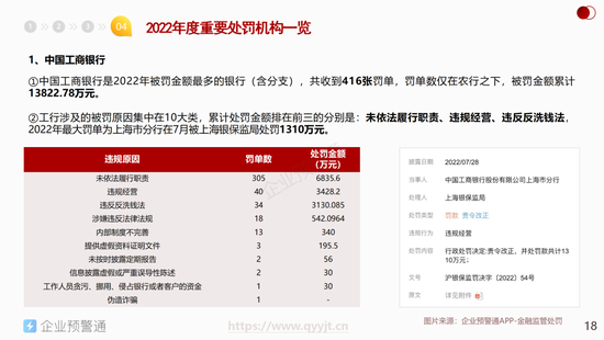 中国工商银行是2022年被罚金额最多的银行(含分支),共收到416张罚单,罚单数仅在农行之下,被罚金额累计13822.78万元。工行涉及的被罚原因集中在10大类,累计处罚金额排在前三的分别是:未依法履行职责、违规经营、违反反洗钱法,2022年最大罚单为上海市分行在7月被上海银保监局处罚1310万元。