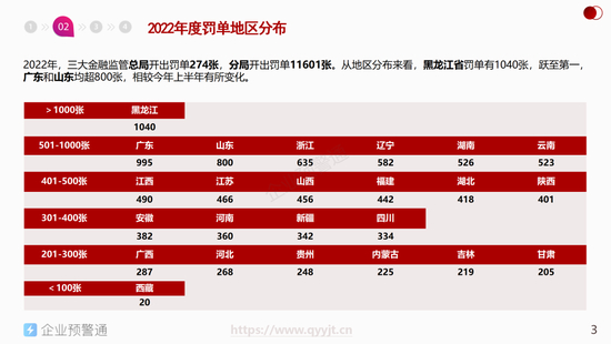 2022年三大金融监管总局开出罚单274张,分局开出罚单11601张,主要集中在分局开出。