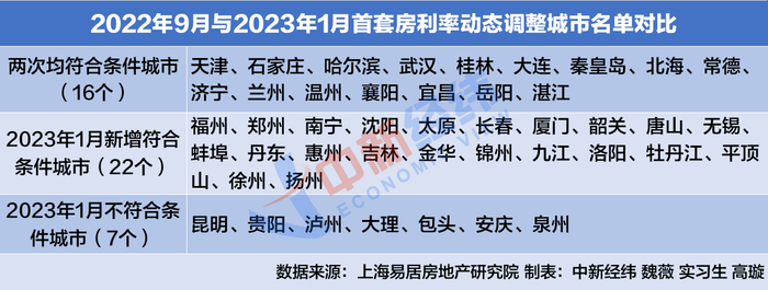 根据机构统计的2022年9月和2023年1月符合条件城市名单,天津、武汉等16个城市两次均在名单中。2022年10月,天津、武汉已将首套房贷款利率下调至3.9%。