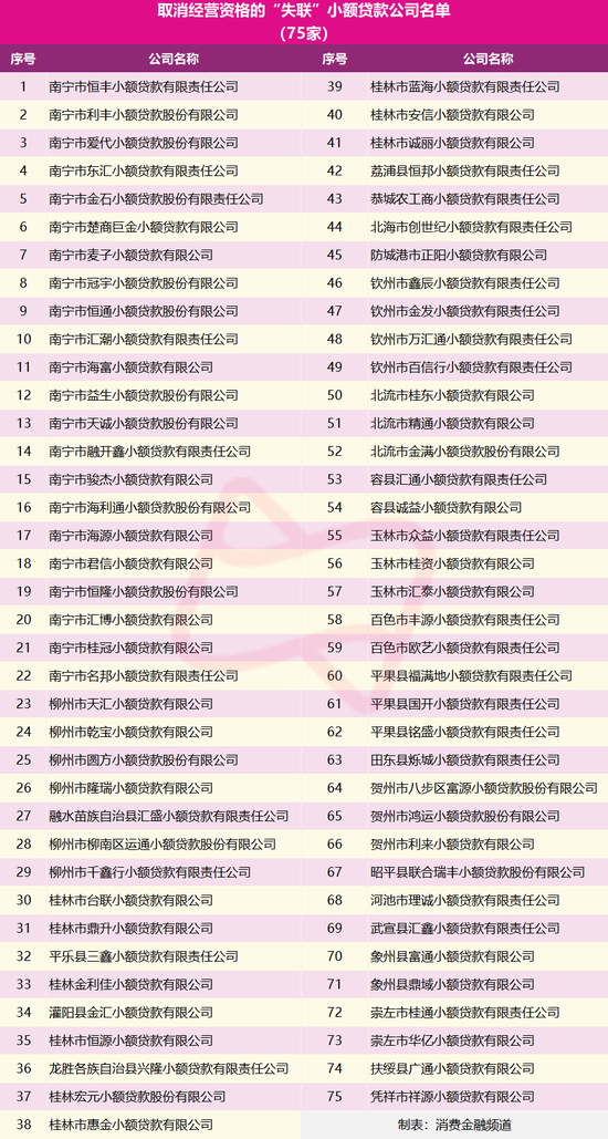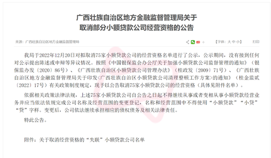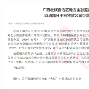 近期,广西壮族自治区地方金融监督管理局发布《关于取消部分小额贷款公司经营资格的公告》,取消了辖区内75家小贷机构的经营资格。