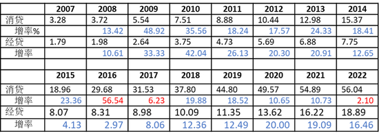 其中,2007年以来住户消费贷款和经营贷款(万亿元)年度变化情况如下: