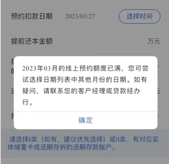 一方面,线上提前还款渠道不稳定,部分客户需要线下办理。以建设银行为例,近期许多使用线上提前还贷渠道的客户表示预约相当困难,大部分日期都显示“线上申请预约额度已满”。据该行客户经理透露,此前是可以实现线上全流程办理的,从去年四季度开始部分转为线下。