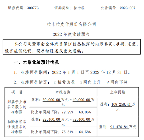 昨日晚间(1月31日),上市公司拉卡拉支付股份有限公司(下称:拉卡拉)发布的2022年度业绩预告,透露出拉卡拉过去一年极为“惨淡”的业绩情况。