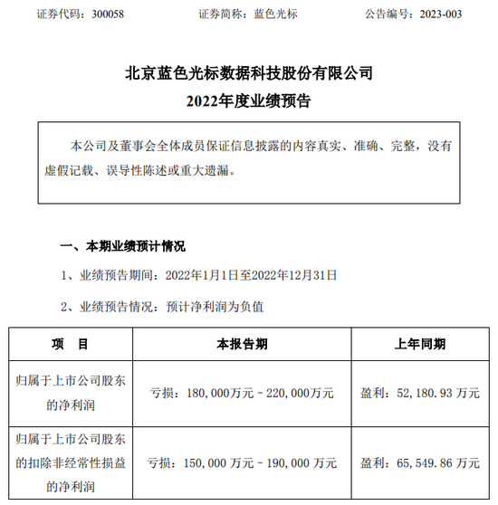 就在日前,蓝色光标也刚刚发布2022年度业绩预告,其中透露公司预计归属于上市公司股东的净亏损正好为18亿元-22亿元。上年同期,蓝色光标尚盈利5.22亿元。