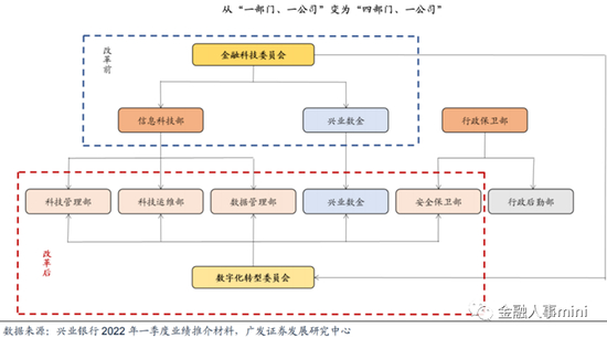 兴业银行设立了数字化转型委员会、科技管理部、数据管理部、科技运维部、安全保卫部,与兴业数金形成“一委员会、四部门、一公司”架构,希望建立起数字化经营与风控体系。并在2022年发布了“兴业管家”“钱大掌柜”“银银平台”“兴业普惠”与“兴业生活”五大线上品牌,以进一步推进数字化转型。