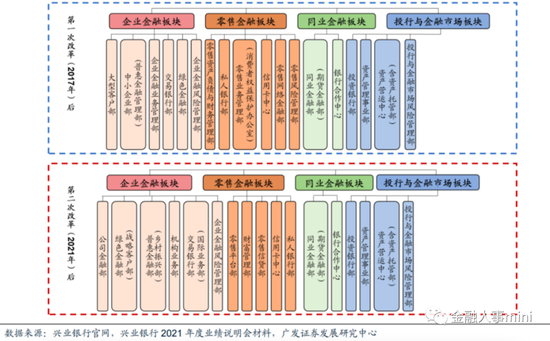 兴业银行形成了公司金融部、绿色金融部加挂战略客户部,普惠金融部加挂乡村振兴部、机构业务部、交易银行部加挂国际业务部,企金风险管理部等六部门。