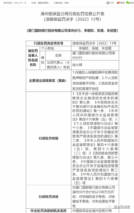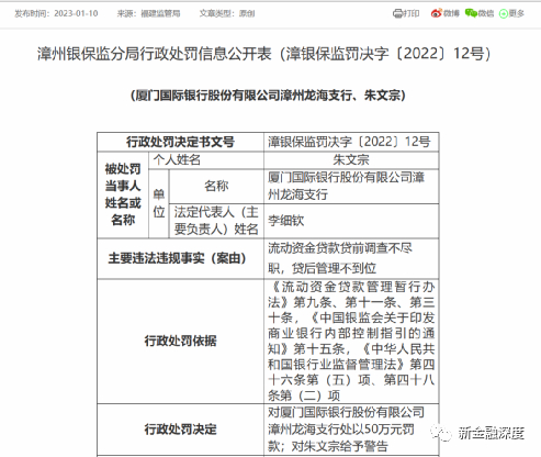 厦门国际银行漳州龙海支行则是因为流动资金贷款贷前调查不尽职、贷后管理不到位两项违规行为,被处以50万元罚款,一名相关责任人被给予警告。