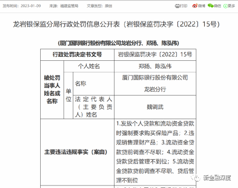 厦门国际银行龙岩分行的罚金最高。罚单显示,该分行存在的违法违规行为包括发放个人贷款和流动资金贷款时强制要求购买保险产品;违规销售理财产品;流动资金贷款贷前调查不尽职;流动资金贷款贷后管理不到位;流动资金贷款贷前调查不尽职、贷后管理不到位等,被合计处以295万元罚款。龙岩银保监分局同时对两名相关责任人给予警告。