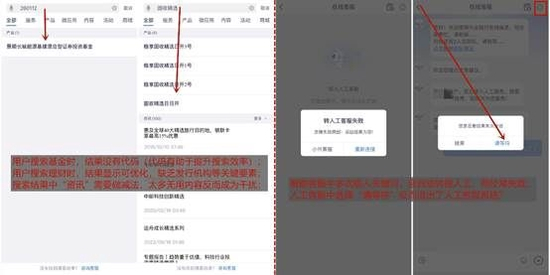 遗憾的是,App搜索体验也有几点可提高:一是,基金产品搜索结果未显示代码;二是,理财产品搜索结果展示不够理想;三是,资讯内容要适当做减法。