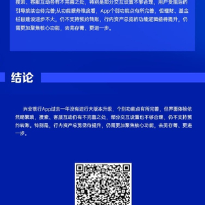综合而言,兴业银行App过去一年没有进行大版本升级,个别功能点有所完善,但界面体验依然略繁琐,搜索、客服互动仍有不完善之处,部分交互设置也不够合理,仍不支持预约转账。特别是,行内资产总览亟待提升,仍需更加聚焦核心功能,去芜存菁、更进一步。