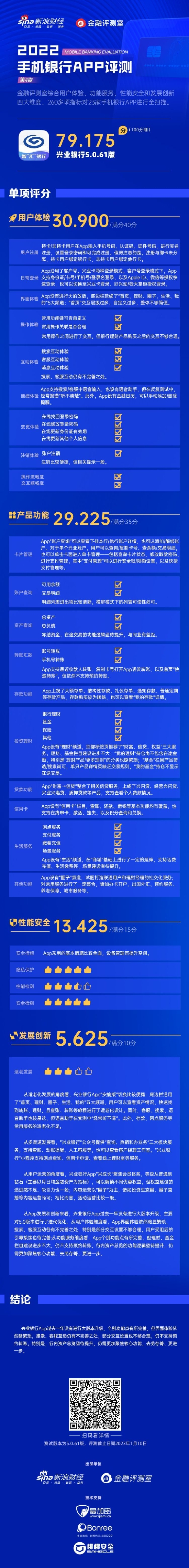 新浪金融评测室综合用户体验、功能服务、性能安全、发展创新4大维度,260余项细分指标对兴业银行手机银行App进行全扫描,最终给予79.175分(总分100)。