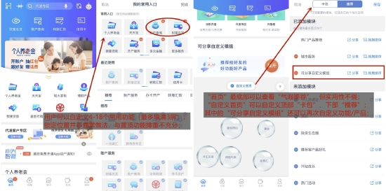 值得注意的是,在自定义常用功能之外,用户还可以“自定义首页”——包括顶部的“卡包”、下部的“推荐”,其中“推荐”中包括了“可分享自定义模组”,而在此模组还可以自定义功能、产品。值得思考的是,用户真的需要这么多“自定义”吗?与同业相比而言,兴业银行App“首页”交互层级过多、自定义过多,整体不够简便。