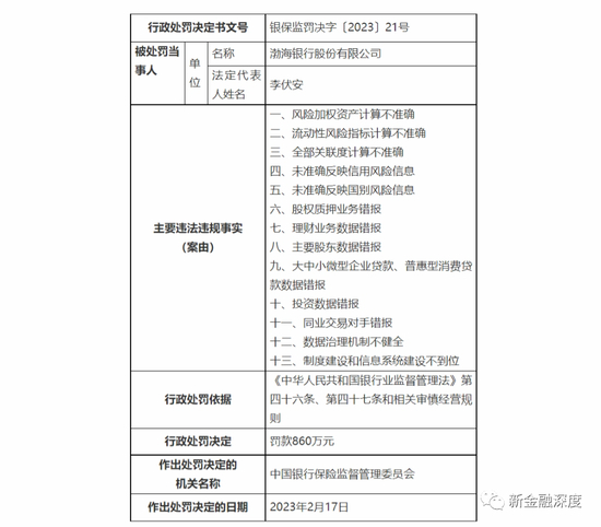 相隔仅一周后,即2月24日,银保监发布的行政处罚公告显示,渤海银行由于涉及13项违法违规案由,被处以罚款860万元。其中,“理财业务数据错报”赫然在列。如此,2023年开年以来,该行已两度因理财业务不合规等受罚,累计罚款2520万元。