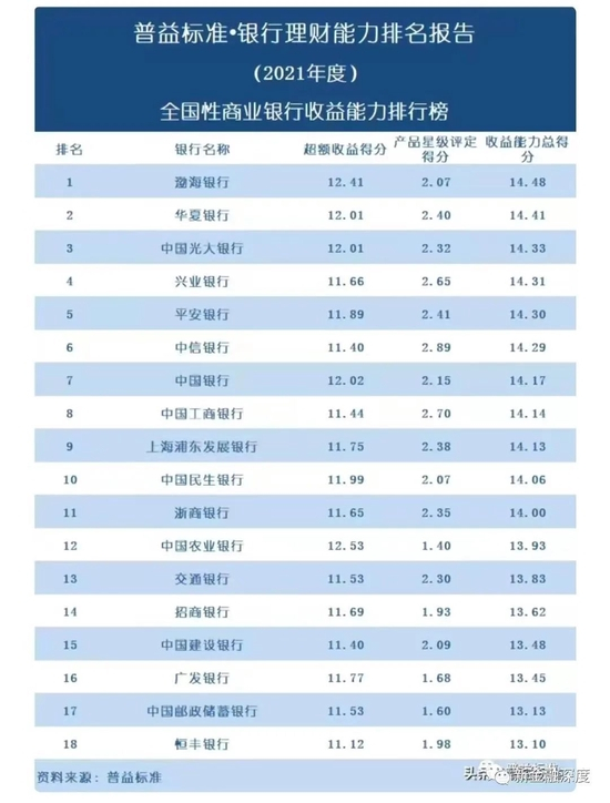 另据普益标准发布的《全国295家银行理财能力排行榜(2021年度)》,渤海银行综合收益能力得分位居全国性银行第一位,加权超额收益得分位居全国性银行第二位。并且,自2018年起,该行理财收益能力已连续四年位居全国性银行榜首。