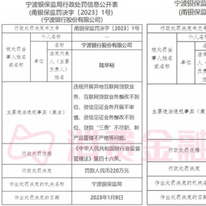 开年,零售小王子宁波银行因违规开展异地互联网贷款业务、互联网贷款业务整改不到位等原因被监管处罚220万元。