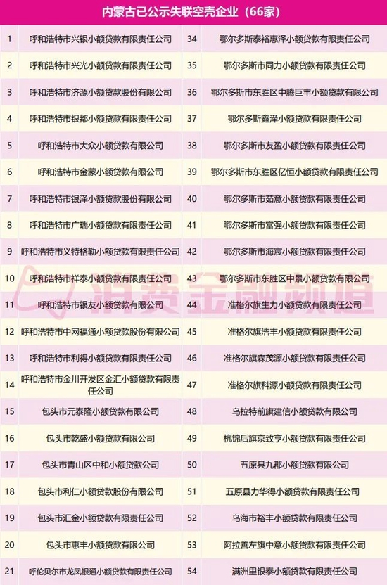近日,内蒙古自治区金融监管局公布了辖区内小额贷款公司、融资担保等金融机构名单。其中,辖区内的小额贷款公司中,有近半数为失联空壳公司。