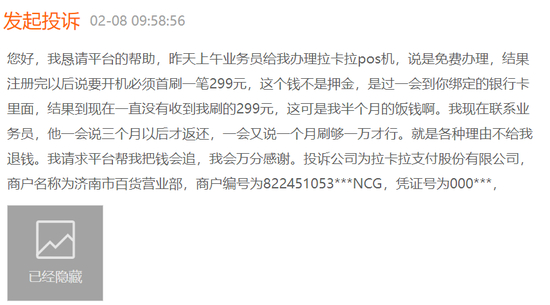 “上午业务员给我办理拉卡拉pos机,说是免费办理,结果注册完以后说要开机必须首刷一笔299元,这个钱不是押金,是过一会返还到你绑定的银行卡里面,结果到现在我也没有收到这笔钱”,有商户在黑猫投诉平台称,“联系业务员,他一会说三个月以后才返还,一会又说一个月刷够一万才行,就是以各种理由不给我退钱。