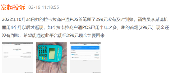 无独有偶,另一位商户于今年2月投诉称,2022年10月24日办的拉卡拉商户通POS,首笔刷了299元没有及时到账,销售员李某说机器使用4个月以后才给返现,如今已经过去近半年之久,刷的首笔(299元)现金还没有到账。