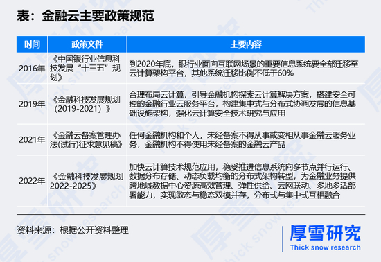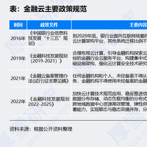 2019年,央行发布《金融科技发展规划(2019-2021)》,要求合理布局云计算,引导金融机构探索云计算解决方案,搭建安全可控的金融行业云服务平台,构建集中式与分布式协调发展的信息基础设施架构,强化云计算安全技术研究与应用。
