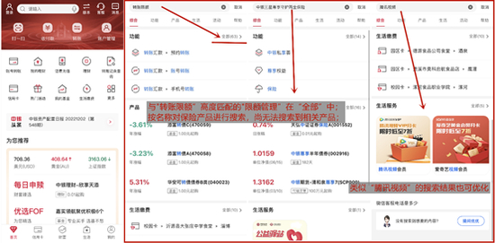 与2021年评测时相比,用户使用产品代码进行搜索,相关结果罗列有所提升。遗憾的是,搜索互动仍有几点可提升之处:一是,诸如“转账限额”等功能点的智能匹配程度可提升;二是,对保险产品的搜索有待提升;三是,“综合”结果的呈现逻辑不够智能,仍可优化。