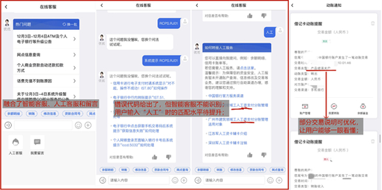客服互动方面,中国银行App各频道均能找到客服入口,重要功能触点的客服覆盖率尚可(差异化匹配仍待提升)。“我的客服”整合了常被问及的功能点、热门问题和在线客服入口;“在线客服”则整合了智能客服、人工客服和留言反馈。
