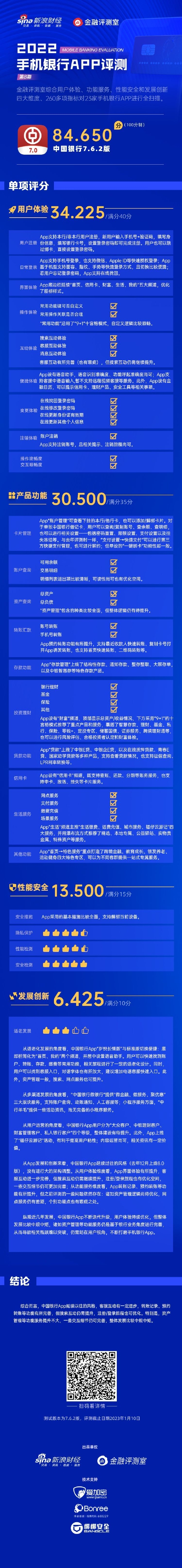 新浪金融评测室综合用户体验、功能服务、性能安全、发展创新4大维度,260余项细分指标对中国银行手机银行App“中国银行”进行全扫描,最终给予84.650分(总分100)。