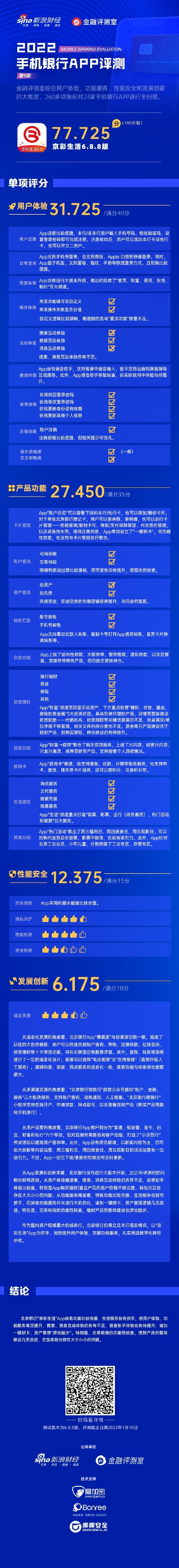 新浪金融评测室综合用户体验、功能服务、性能安全、发展创新4大维度,260余项细分指标对北京银行手机银行App“京彩生活”进行全扫描,最终给予77.725分(总分100)。