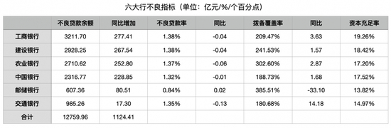 从六大行财报看,截至2022年末,六大行不良贷款余额共计12759.96亿元,较2021年末增加1124.41亿元。