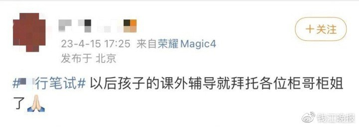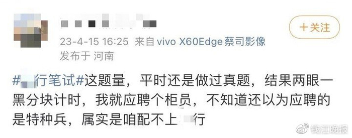 有不少网友在社交平台分享参加银行笔试的经历,“银行笔试,最强大脑来了都要皱眉”“银行柜员得上知天文下知地理”“以后孩子的课外辅导就拜托各位柜哥柜姐了”……题量大,难度高是多数考生普遍的感受。