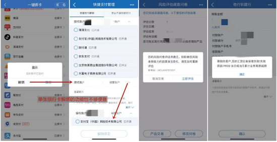 此外,部分旅程的交互体验有待提升,比如用户提交基金产品申购后的提示、交互尚待优化;2021年评测时指出的问题也依然存在,诸如“账户→添加账户”、“转账设置→转账限额设置”的交互层级不够清晰。特别是,在多机型测试中,个别安卓机型出现不兼容的情况;多位评测员在评测时也遇到闪退现象。