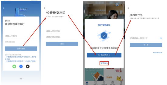 注册方面,中国建设银行App新用户输入手机号、图形验证码,接收短信验证码,设置登录密码即可完成注册。注册成功后,用户可以选择添加银行卡,添卡旅程比较清晰。