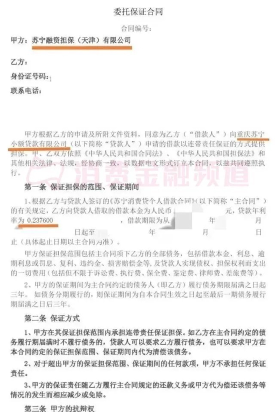 根据一份借款人提供的借款合同,此前通过星雨小贷进行个人借款时,必须要向苏宁融资担保(天津)有限公司支付年费率为11.88%的担保成本,而星雨小贷本身的借款年利率为23.76%,这笔借款的综合年利率为35.64%,已经超过了司法保护上限的24%。