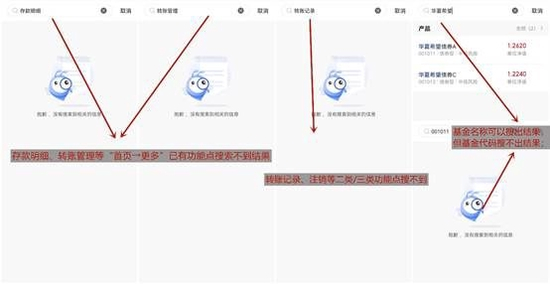 搜索互动方面,恒丰银行App“首页、财富、发现和生活”频道设有搜索入口,可以查看历史搜索,支持对功能、产品的搜索,但仍不及同业水平:一是,App依然不支持全局搜索,大部分同业已支持对活动、商品等全局搜索;二是,诸如“转账管理”、“存款明细”等“首页→更多”已有功能点搜索不到结果,更不用提“转账记录”、“注销”等二级/三级功能点;三是,用户可以用名称搜索出产品,但不能用代码搜索出产品,对于基金产品的搜索非常不方便;四是,用户搜索不到结果时,无法求助客服延长用户旅程。